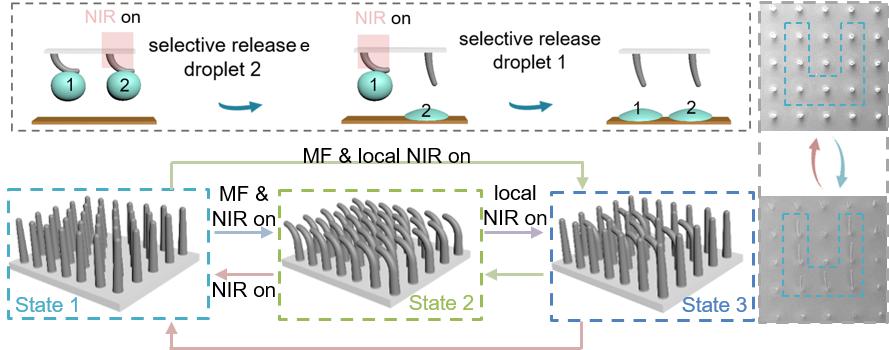 近日,在此基础之上,吴思竹副教授课题组和机械学院刘焜教授课题组合作,通过向SMP微锥阵列中掺杂磁性铁粉颗粒可以实现微结构对近红外光和磁场的刺激作出响应,从而实现对智能微结构的全方位非接触式形貌调控(Adv. Funct. Mater. 2021, 2100543)。利用这种形态可控的智能微结构可以实现对微小液滴的多功能操控,在生物液滴检测和微化学反应等领域有着潜在的应用。同时,这种智能结构还可以实现信息的加密和解密功能,有望在二维码加密和解密领域发挥重大作用。