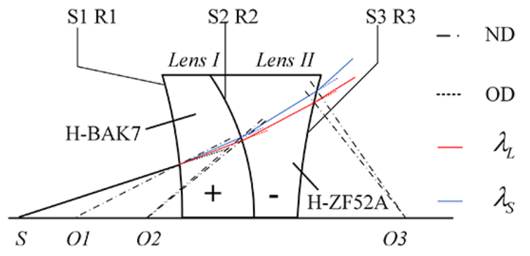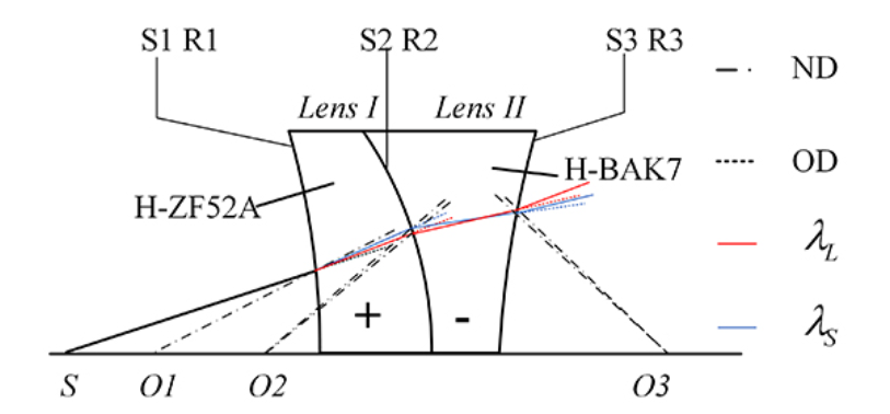 光谱共焦测量方法无需使用机械扫描测量系统即可实现大范围的轴向绝对测量。该技术通过扩大光学系统的轴向色差,将宽光谱白光光源各个波长聚焦在不同平面或焦点上,建立波长与轴向位置一一对应关系。然而,在设计光谱共焦传感器光学系统时,选择合理的光学系统初始结构,实现不同波长的光在轴向分离,并在轴向产生大范围的色差,仍然是一个挑战,也是决定传感器设计成功与否的关键。目前的研究表明,光谱共焦传感器至少会使用一组双胶合透镜以产生足够的轴向色差。