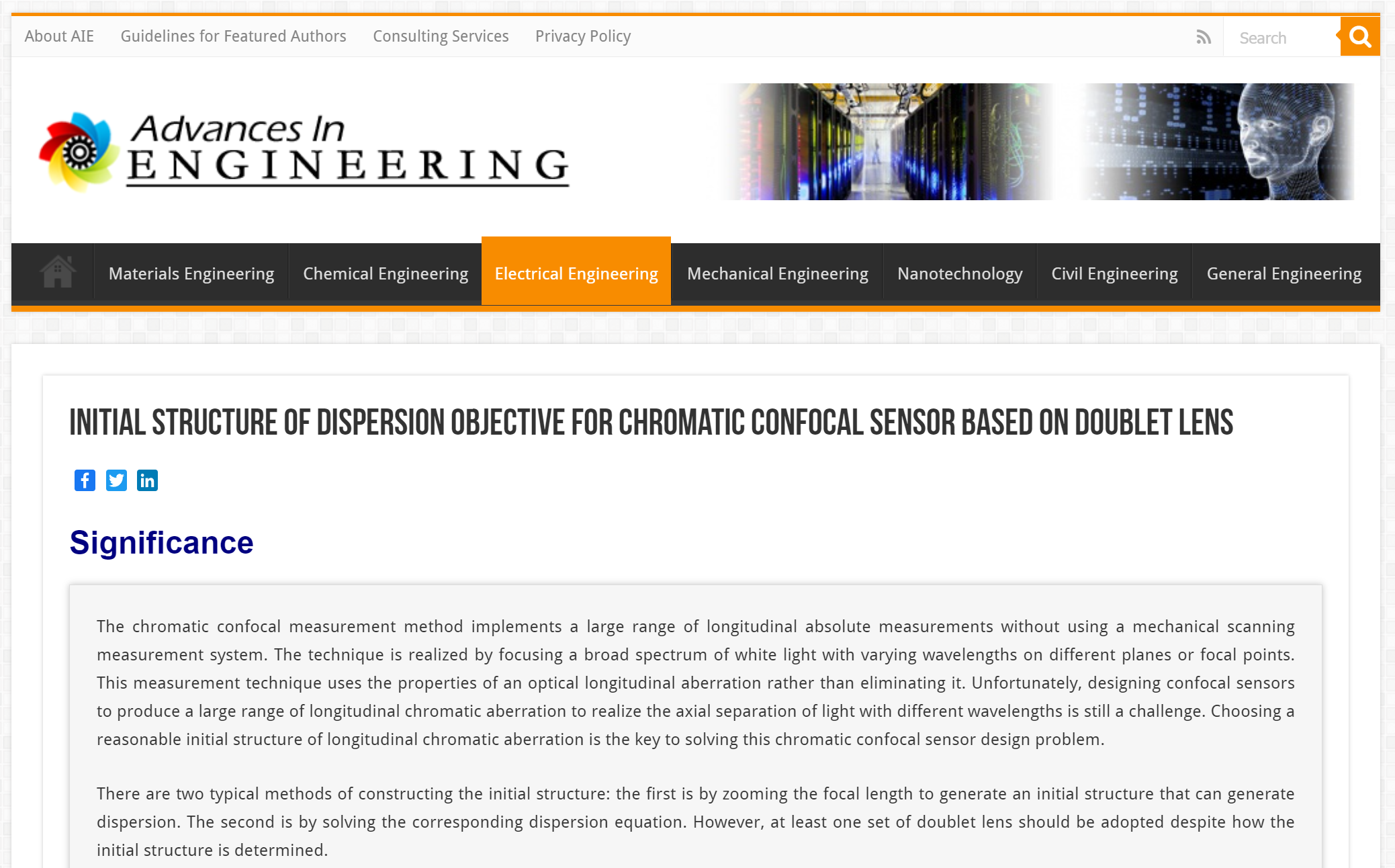 Advances in Engineering(AIE)报道原文链接:Initial structure of dispersion objective for chromatic confocal sensor based on doublet lens - Advances in Engineering (advanceseng.com)