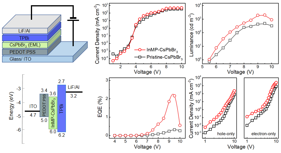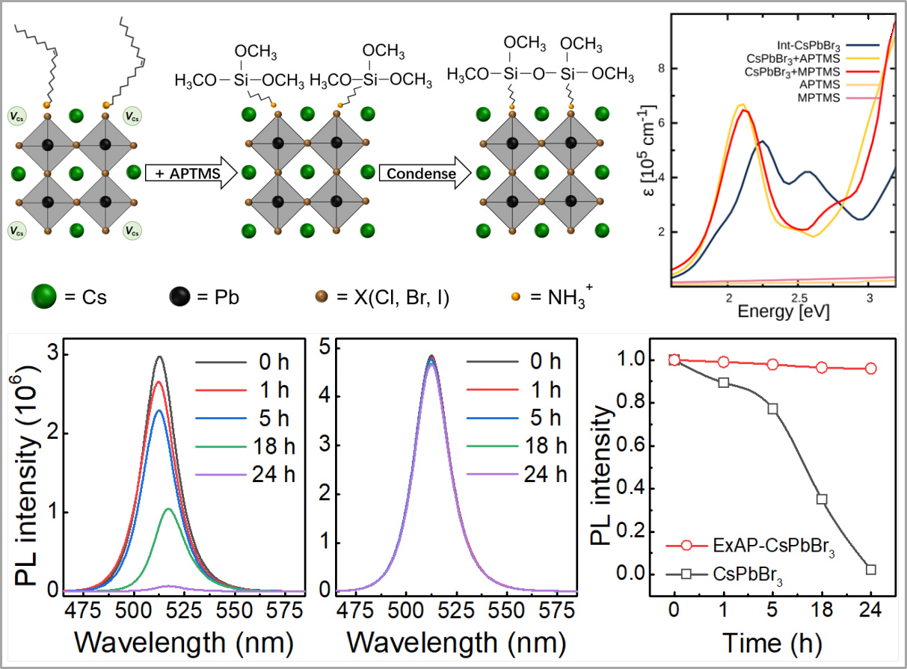 高性能卤素钙钛矿量子点发光材料的荧光量子效率接近100%,在量子点基础研究和应用研究领域均具有重要研究价值。近几年应用研究聚焦的方向包括:如何制备高性能蓝光量子点材料,如何解决色转换LED应用中光稳定性问题和如何提升电致发光应用中的载流子注入效率。我院王向华课题组,依托安徽省特种显示和成像技术创新中心,测量理论与精密仪器安徽省重点实验室,根据巯丙基硅氧烷(MPTMS)在控制硫化铅纳米团簇生长,实现吸收增强等实验观测中的重要作用,推测其在钙钛矿量子点改性方面的应用价值。课题组采用配体交换和原位钝化的方式引入硅氧烷配体,在上述三个应用研究方向取得了重要进展。