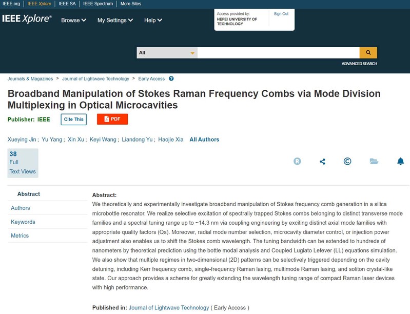 近日,我院夏豪杰教授课题组青年教师金雪莹首次在微米尺度的光学微瓶腔平台上实现了拉曼光频梳的多模态选择性激发及宽带光谱调谐,相关研究成果在线发表在国际著名光学领域期刊Journal of Lightwave Technology上。金雪莹老师为第一作者,夏豪杰教授为通讯作者。
