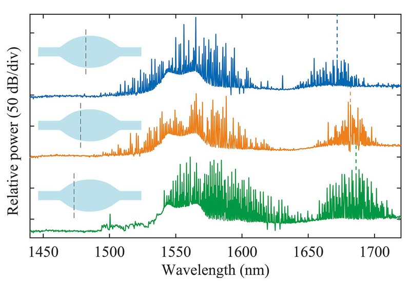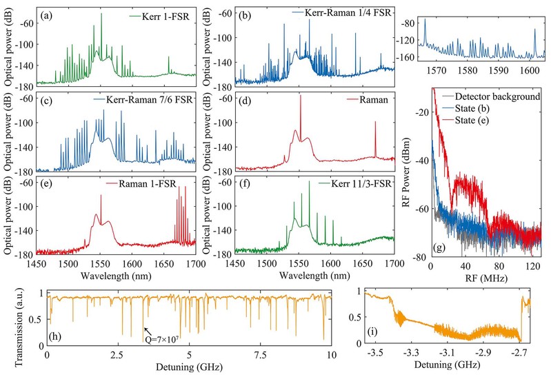 研究团队基于微瓶腔的模式理论和耦合Lugiato Lefever (LL)方程,从理论上推导和分析了微瓶腔内拉曼光频梳的调谐机理和产生工作过程,证明了百纳米光谱调谐的可能性。在实验中,该团队利用微瓶腔特殊的模式结构,证明了不同横向模式族的选择性激发能够产生大范围的光谱调控,理论和实验证明了新型拉曼光频梳调控方法的普适性。此外,通过改变微腔半径、或者调节泵浦功率也可以实现拉曼光频梳的光谱调谐。同时,实验中观测到二维拉曼-克尔光频梳的多模状态激发和切换,包括克尔光频梳、单频拉曼激射、多模拉曼激光和孤子晶体态。因此,新型拉曼微激光器可以作为高性能的锁模飞秒光频梳光源,应用于光钟、6G通信、精密光谱测量等应用系统。