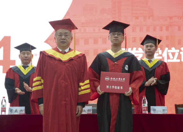 吴玉程为博士学位获得者和“安徽省品学兼优毕业生”代表逐一颁发学位证书并扶正流苏。与会领导、教师为其他学位获得者扶正流苏并合影留念。