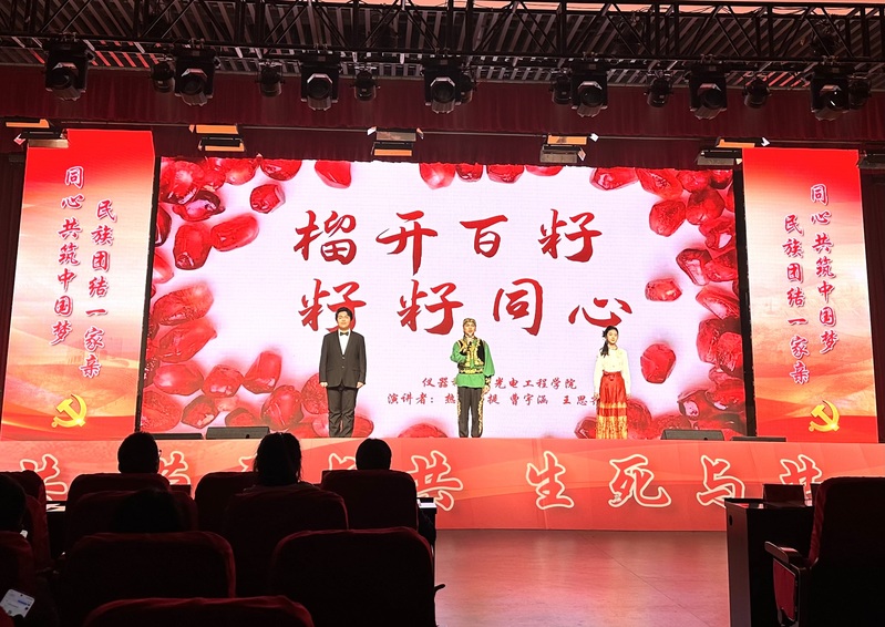 12月12日晚,“民族团结一家亲,同心共筑中国梦”铸牢中华民族共同体意识主题展演在翡翠湖校区举行。仪器学院选送的演讲作品《榴开百籽,籽籽同心》以总分第二名的佳绩获得语言类比赛二等奖,学院获优秀指导教师奖、优秀组织奖。
