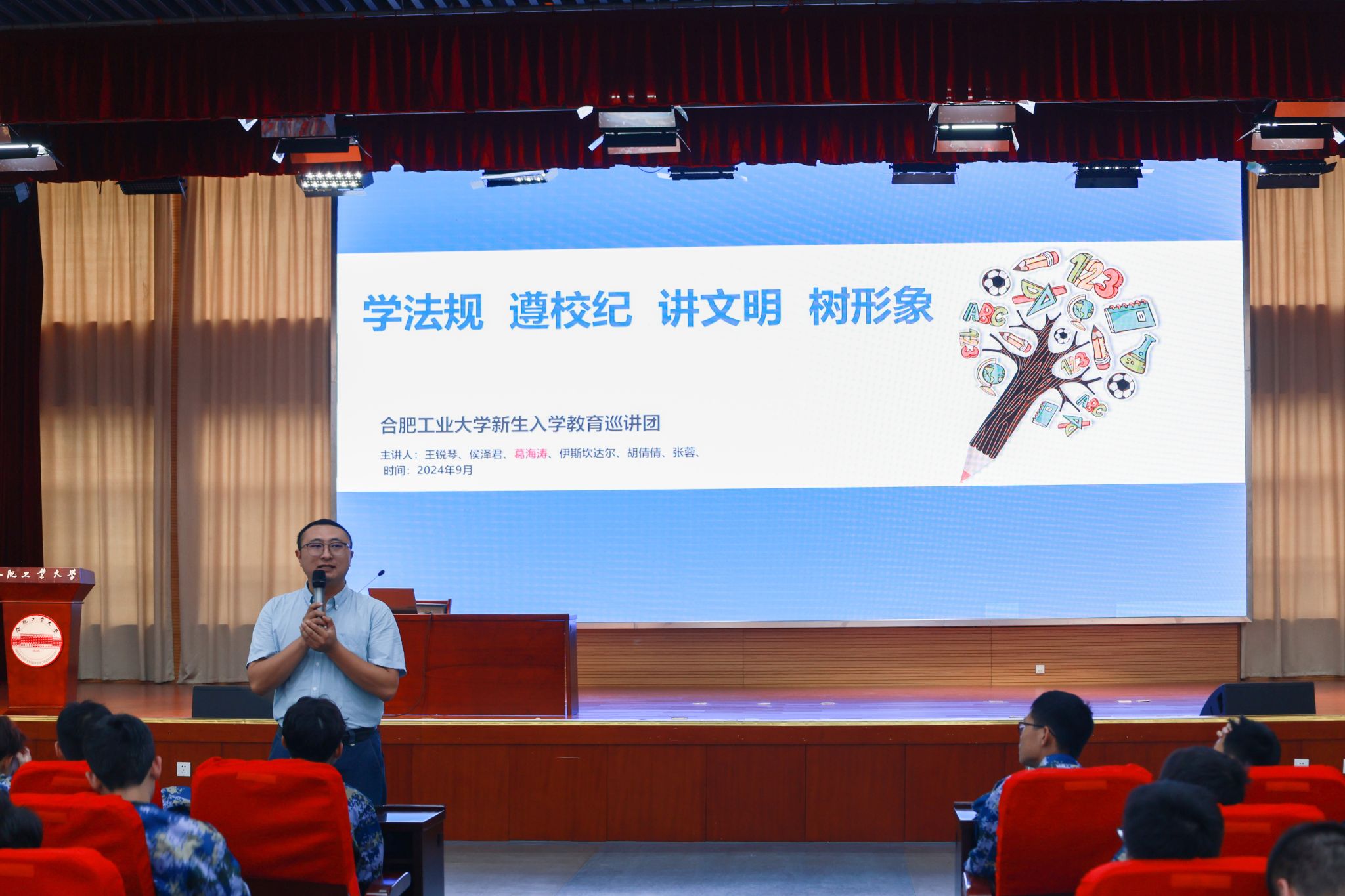 为引导新生树立自律意识、强化遵纪守法观念,9月5日上午,仪器学院、化工学院于翡翠湖校区科教楼报告厅联合开展校纪校规教育。此次活动邀请入学教育巡讲团成员葛海涛担任主讲,面向2024级全体本科新生。