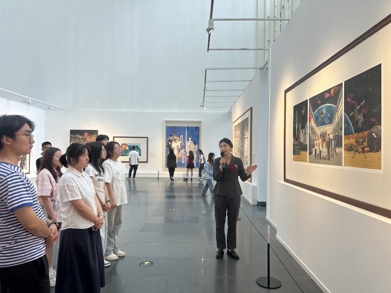 在“拥抱繁花——新艺术运动与阿尔丰斯穆夏”展厅内,同学们在馆内讲解员的细心讲解下感受到穆夏画中灵动飘逸的线条勾勒、繁复精美的装饰纹样,了解到每幅画背后创作背景与作品设计构图之间精妙的联系。移步至“安徽新时代现实题材美术作品展”,一场浓缩的安徽发展画卷徐徐展开。《京福高铁美徽州》、《“芯屏汽合”》、《世界制造业大会》等众多优秀的展品在同学们的眼前呈现,全景式呈现了新时代安徽在科技创新、乡村振兴、生态保护、民生改善等领域的辉煌成就。这些作品不仅是艺术匠心的凝聚,更是时代精神的鲜活写照,让同学们在观赏中深切感受到安徽在时代浪潮中的铿锵步伐。
