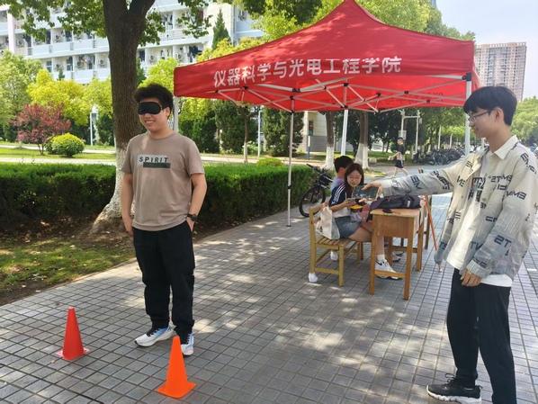 “信任盲行”活动在一食堂下沉广场举行,参与者两两一组,一人蒙上双眼,另一人通过语言指引,带领伙伴穿越复杂的障碍路线。活动现场,蒙眼者小心翼翼地挪动脚步,指引者耐心细致地给出指令。有的小组配合默契,顺利通关;有的小组虽偶有失误,但也在欢声笑语中完成挑战。每一次顺利的指引、每一次及时的搀扶,都让大家深刻体会到信任与被信任的力量,明白了在成长道路上,有伙伴携手同行是多么珍贵。