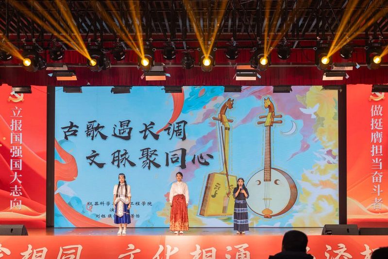 11月21日,“斛兵红石榴 同心谱新篇”艺术思政大课在翡翠湖校区举行,仪器学院党校第74期积极分子班学员代表参与观演。各民族学员代表通过朗诵、民族歌舞等形式,以真挚情感赞颂祖国、弘扬团结精神,绚丽服饰与灵动舞姿展现出中华民族多元一体的文化底蕴,筑牢学员民族团结意识。