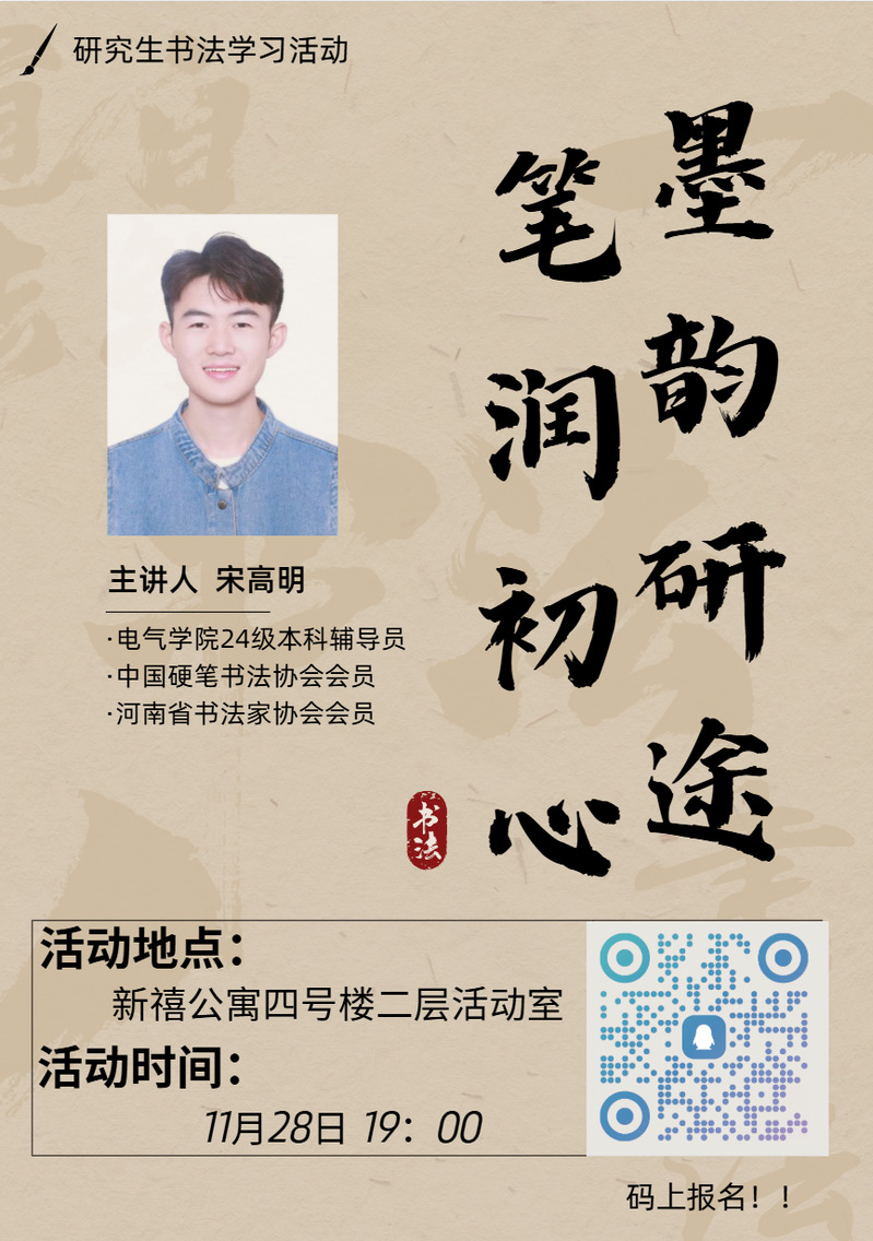 为弘扬中华优秀传统文化,提升研究生人文素养与美学情操,2025年11月28日晚7时,“墨韵研途·笔润初心”研究生书法美育实践活动在新禧公寓4号楼二层活动室成功举行。本次活动由仪器学院和管理学院共同主办,电气学院协办,吸引了众多研究生同学参与。