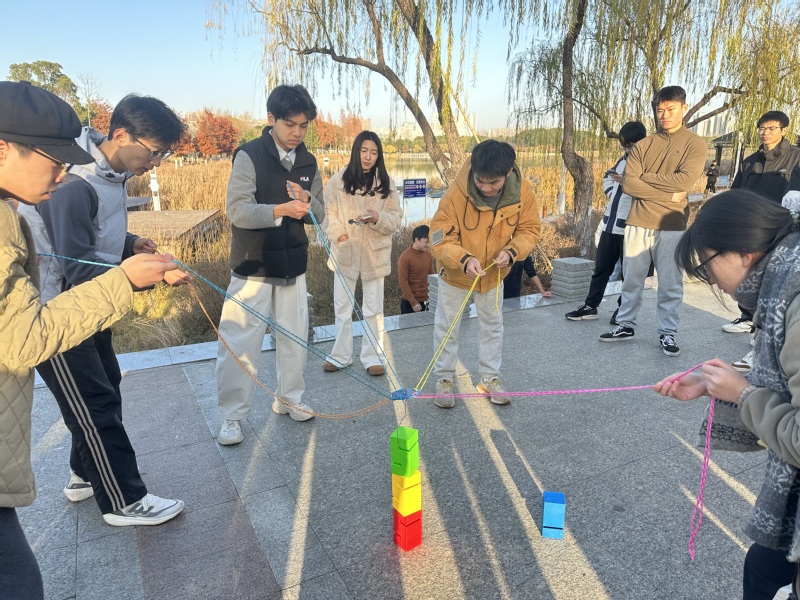 活动伊始,参与学生伴随轻音乐沿湖漫步,在自然景致中舒缓压力、调整状态,完成身心放松的基础铺垫。核心协作环节中,学生被分为四组,依次参与“不倒森林”“珠行万里”“合力建塔”三项素质拓展项目。各项目分别聚焦专注力培养、衔接配合能力与协同操作素养,引导学生在实践中感悟团队协作的核心要义,提升沟通协调与问题解决能力。现场氛围紧张有序、互动热烈,各组学生充分发挥主观能动性,在相互支持中完成项目挑战。活动最终依据三项项目累计积分,评选出一、二、三等奖,实现竞技性与参与感的有机统一。
