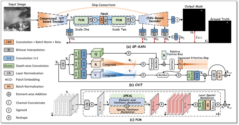 针对上述问题,团队提出了基于稀疏正弦感知的科尔莫戈洛夫-阿诺德网络SP-KAN,将该任务建模为由稀疏非线性模块驱动的全局上下文调制问题:提出模式互补模块PCM,将符号化表示的通道映射与结构化表示的局部空间统一建模,增强目标与杂波的可分性;引入稀疏正弦感知层SPKAL在像素层面感知原始非线性空间与高维正弦潜空间,建立神经元间细粒度关系。实验结果表明,SP-KAN在检测精度、鲁棒性和泛化能力方面优于主流方法。该项研究提出的红外小目标检测方法能够为复杂场景下红外小目标鲁棒检测与智能感知提供理论方法和关键技术支撑,对远距离态势感知系统建设具有重要意义。