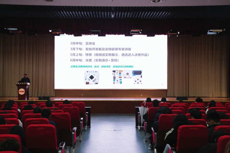 3月11日晚,必赢线路检测3003在翡翠湖校区科教楼大报告厅举办第十三届“瑞萨杯”科技制作大赛暨第九届全国大学生嵌入式芯片与系统设计竞赛动员赛宣讲会。学院大学生创新实践中心主任张阳副教授主讲,2024级、2025级全体同学参加。